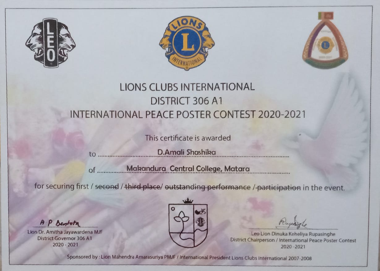 05 Apr2021 ජාත්යන්තර සාමය පිලිබද පෝස්ටර් තරගයේ ජයග්රහණය (2020-2021) මාකඳුර මධ්ය මහා විද්යාලය කලා අංශයෙන් ජයග්රහණයක් ලබයි. 2021 දී පැවති ජාත්යන්තර සාමය පිලිබද පෝස්ටර් තරගයෙන් ප්රථම ස්ථානය ලබා ගැනීමට ඩි.අමාලි ශෂිකා ශිෂ්යාව සමත්ව ඇත. Read more ...